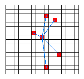 Also the size of such a neighborhood does not need to be the same for every neighborhood. So every cell can be differently, and arbitrarily wired to a set of other cells anywhere in the grid, forming its non-local neighborhood. In this way a complex network of (wired) cells can be formed.