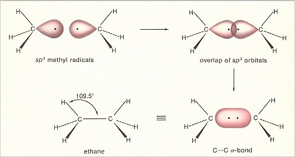 When we have a sp3 hybridized carbon atom, thus with four sp3 orbitals, then three of them can overlap with, say, hydrogen (Here we expound the formation of the Ethane molecule). In this way we obtain a so-called Methyl radical, CH3. This still contains a left-over sp3 orbital. We now can couple two such methyl radicals together by letting these left-over sp3 orbitals overlap each other, resulting accordingly in a sigma-bond between the two carbon atoms ( The bonds with the hydrogen atoms also are sigma-bonds).