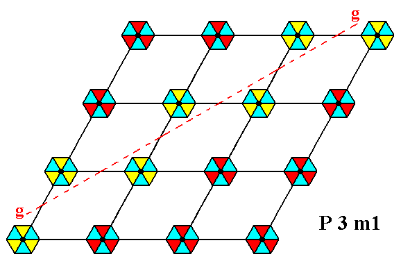 The symmetries involved in a pattern representing Plane Group P3m1 are 3-fold rotation axes, mirror lines and glide lines. See Figures 3c, 3d, 3e and 3f.