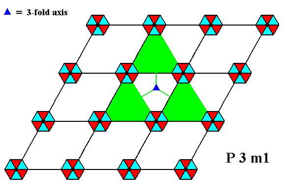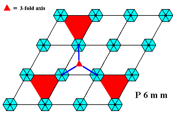 Figure 3f. A pattern representing Plane Group P3m1 has 3-fold rotation axes perpendicular to the plane of the drawing. Again one of them is indicated (small blue triangle).