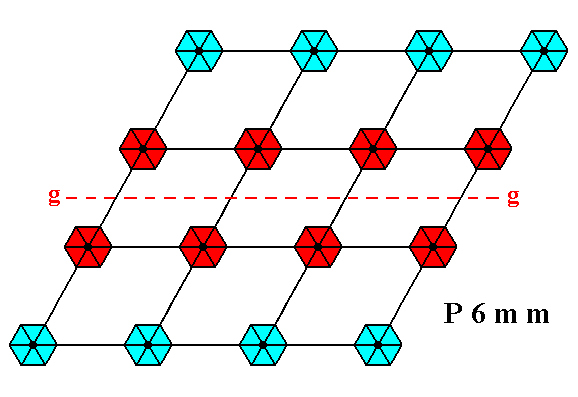 The symmetries involved in patterns representing Plane Group P6mm are simple translations, glide lines, mirror lines, 6-fold, 3-fold and 2-fold rotation axes. Some of these symmetries are shown in the next Figures.