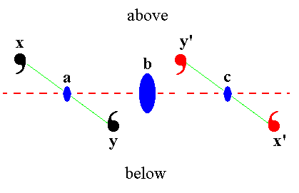 We see the three 2-fold rotation axes a, b and c (See Figure 11aa), depicted as blue solid ellipses. The axis b, relating the two motif pairs is emphasized. The dashed red line represents the projection plane (here seen, not as a plane but as a line, in virtue of our direction of view).