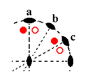 Figure 11aa. Part of a stereogram (see (3) in Figure 11a in the main document) showing two pairs of (projections of) face poles (sometimes called motifs) related by a 2-fold rotation axis. Also the members of each pair are related to each other by a 2-fold rotation axis. The next Figure shows that these pairs are repetitions of each other, i.e. they are congruent.