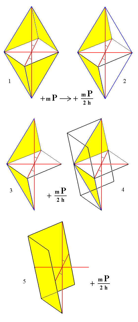 (2). Removal of the faces on the right side of the hemipyramid, expressing the suppression of the mirror plane.