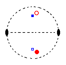 Figure 13. Stereogram of the symmetry elements of the Monoclinic-sphenoidic Crystal Class, and of all the faces of the most general Form. There is one 2-fold rotation axis (indicated by a pair of small solid ellipses) as being the only symmetry element of the Class. The projection of the piercing points of the clino axis ( = a axis ) is given in blue : the lower piercing point is represented by an open square, the upper piercing point by a solid square. |