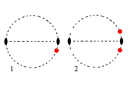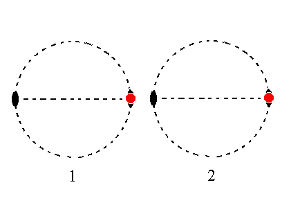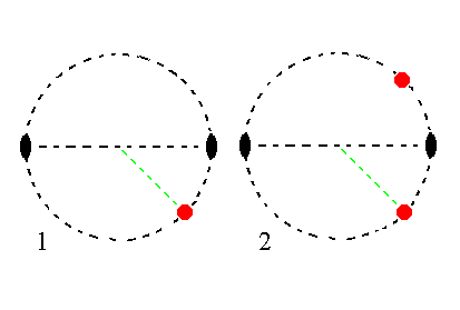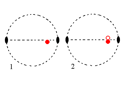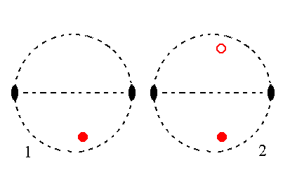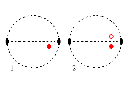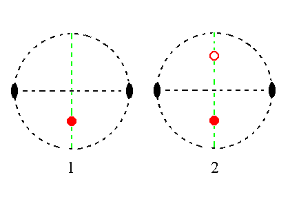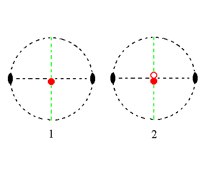 Figure 15. (1). Position of the face na : b : mc in the stereogram of the symmetry elements of the Monoclinic-sphenoidic Crystal Class. (2). The face is duplicated by the action of the 2-fold rotation axis resulting in a Monoclinic Sphenoid. |