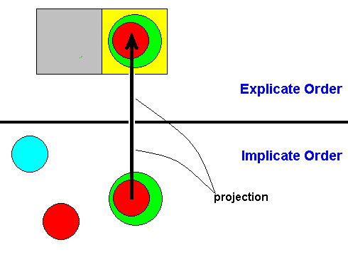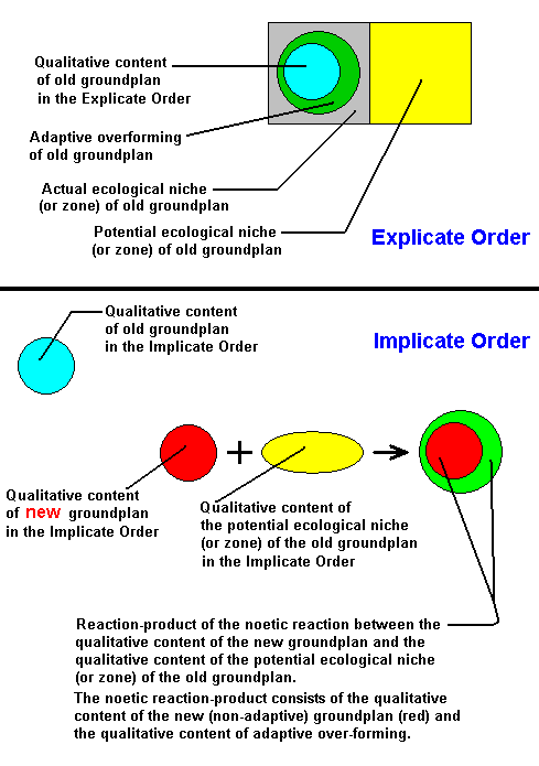 Figure 17 : We see the qualitative content (blue disc) of some given old dipterous groundplan as it is, as a noëtic entity or pattern, present in the Implicate Order. We also see this same qualitative content being overformed by adaptive structures (dark green), also existing as a noëtic entity (in fact a reaction-product) in the Implicate Order. (A copy of) this complex noëtic entity has been projected into the Explicate Order where it exists in the actual ecological niche (or zone) (brown). At the same time this groundplan defines a potential ecological niche (or zone) (yellow) that can be reached by evolutionarily aquiring special adaptational structures. If this potential ecological niche (or zone) is actually present in the Explicate Order (a copy of) it can be injected into the Implicate Order where it then exists as a noëtic entity (yellow).