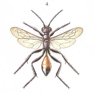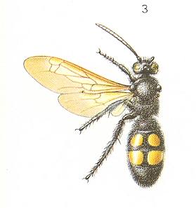 It is interesting that already among the bethyloid wasps the small black Epyris extraneus Brid. (of the Epirinae, family Bethylidae), similar in its look to Tiphia, shows a striving for displacing its prey. For this wasp, see next Figure.