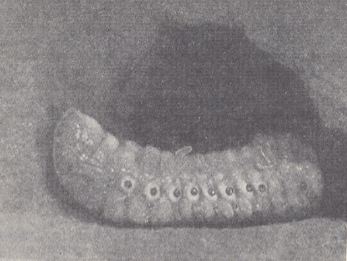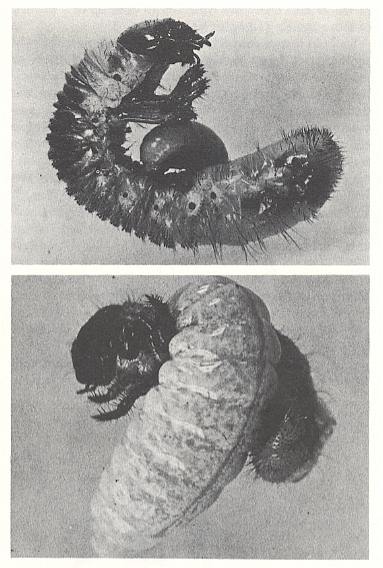 Figure 13 : The larva of Tiphia (Tiphiidae) feeding on a grub of the Japanese beetle. Top image, a young larva that has fed for only a day or two. Lower image, a nearly mature larva that has almost consumed the grub.