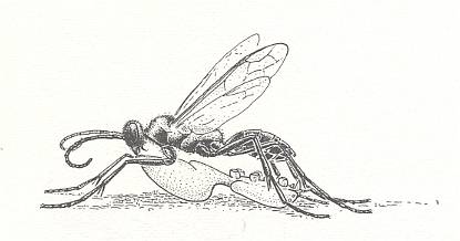 This epyrine attacks the larva of the mealbeetle (Tenebrionidae) -- which is remarkably larger than the wasp itself -- and paralyzes it almost to complete immobility. Then it grabs the prey, apparently at its antenna, and drags it, while moving backwards, into one or another crack in the soil. There it makes some deepening around the beetle larva and adheres one egg to the prey [that egg] in a strictly determined position : on the ventral side of the first abdominal segment in a longitudinal direction such that the head-end of the egg is directed to the head of the prey. The hatched epyrine larva first lies along the prey's abdomen (see next Figure), but later assumes a vertical position, making a right angle with the body of the prey. Having finished feeding, the larva leaves the remains of the prey and makes a cocoon.