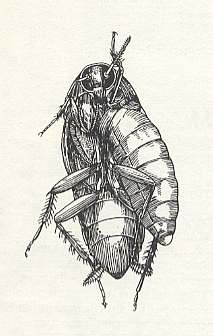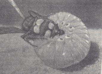 Figure 15 : Larva of Ampulex caniculatus Say. (Ampulicidae) feeding on a paralyzed woodland cockroach. (After WILLIAMS, 1929, in MALYSHEV, 1966)