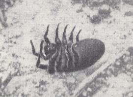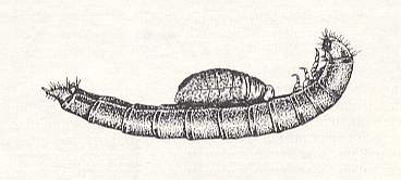 Figure 6 : Young larva of Epyris extraneus (Bethylidae) on the larva of the mealbeetle Gonocephalum. (After WILLIAMS, 1919, in MALYSHEV, 1966)