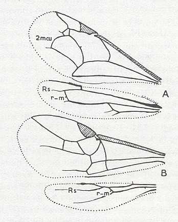 Figure 2 : Left wings of, A, an Ichneumonid and, B, a Braconid, to show the absence of 2m-cu in the forewing of the latter, and the different positions of r-m in the hindwing. ( Ichneumonidae and Braconidae are families of the Apocrita-Terebrantia).