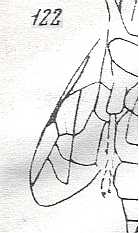 In the upper wing we see RS ending at the end of the anterior wing-margin. Below it we see a minute appendage by far not reaching the wing margin. It is the [end of the] Media. Then we see the long cross-vein 2m-cu connecting the Media with the Cubitus (CuA). Also this cubitus does not reach the wing-margin. For an interpretation of the wing-venations depicted here, see FURTHER BELOW .