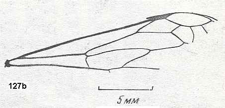 The Ephialtitidae are morphologically in such a high degree primitive that we can, without special qualifications, see them as an ancestral group of all remaining Apocrita. As to their structure, they are still very close to the lower Hymenoptera ( Symphyta), especially to the Karatavitidae. Apparently, we may indicate only two reliable diagnostic characters by which the Ephialtitidae and Karatavitidae may be distinguished (but not all Apocrita from all Symphyta!) : (1) The position of the first segment of RS of the forewing -- In Karatavitidae it is directed obliquely to the wing-apex, whereas in Ephialtitidae it is perpendicular to R, or, more often, directed to the base of the wing, and (2) (as a second diagnostic character distinguishing the Ephialtitidae and Karatavitidae) if it were only the partial reduction of 1r-rs. Thus, the Ephialtitidae, judging from the available data, represent the "missing link" between Symphyta (as represented by the Karatavitidae) and the remaining Apocrita. In this, the morphological gap is, in both cases, albeit neat, not deep. Especially, the mentioned differences between the Karatavitidae and the Ephialtitidae are, apparently, not directly connected with the change of the way of life as it is supposed to have taken place in the Ephialtitidae, that is, with the transition from feeding [of the larvae] on wood to zoophagy (a similar position of the first segment of RS is known in a whole series of lower Hymenoptera, including also Siricidae ( Figure 124 [previous document] ) [of which the larvae still live in wood, i.e. are xylophagous] which are rather closely related to the Karatavitidae, and the reduction of the cross-vein 1r-rs as it is seen [not only in Ephialtitidae but also] in Cephoidea and Orussoidea.