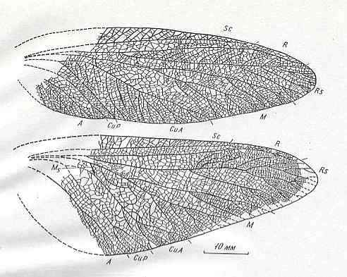 In the left-hand image we have Sc1, Sc2, being branches of the Subcosta, and R1, R2, R3, R4, R5, being branches of the Radius, etc. (From SHAROV, 1966)It was considered that all the various types of venation of Pterygota are derivatives of this original type. Where the number of branches did not correspond to the scheme, it was considered that the branches had either fused or divided, and the venation of such forms was artificially fitted into the scheme mentioned.