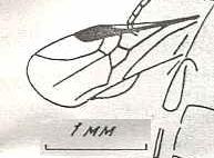 Forewing : Subcosta absent. Pterostigma well developed. Radio-Medial T-vein and Radio-Medial Triangle well developed. The Triangle is broad. Origin of RS close to the base of the pterostigma. The cross-vein 1r-rs absent. Cross-vein 2r-rs present. RS unbranched, reaching wing-margin. Cross-vein 2r-m present. Cross-vein 3r-m absent. Cross-vein 1m-cu present. Cross-vein 2m-cu absent. RS, M, and CuA reach the wing-margin (CuA almost reaches it). Anal area reduced, but the first anal vein is present. Forewing more or less triangular. Despite its small size (1.8 mm) this wing has a fairly complete venation.
