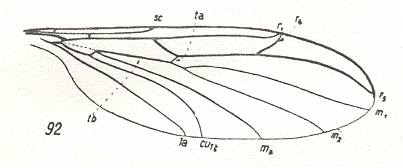 The wing-venation is rich, very little reduced, and [as such] comparable with other Mecopteroidea [containing the order Diptera, Trichoptera (caddis flies), Lepidoptera (butterflies and moths), Mecoptera (scorpionflies), and one or more fossil orders], especially with certain Paratrichoptera [a fossil Mecopteroidean order]. Costal, Subcostal, and Radial veins always run parallel, having become more or less near to each other, and extending up to the place of curvature of the anterior edge, that is, up to where the apex of the wing starts. It is only this feature that guarantees [a degree of] costalization of the primitive traction (tipuloid) wings. It [that is, costalization] is almost not expressed by the rest of the wing's structural features (apart from the presence [where indeed it is] of the anal lobe ! ). [Costalization of the wings can be realized in different ways. Generally we can say that costalization means that the wing-skeleton concentrates on the anterior half of the wing. It has either shifted towards that half (and from there, often towards the wing-base), or the posterior half of the venation is partly reduced or weakened and/or the veins of the anterior half have thickened. So the wing-blade has, in the case of costalization, qualitatively differentiated into an anterior and posterior half. It is clear then that the development of a large anal lobe, totally or almost devoid of (strong) veins, contributes to this differentiation and thus to the wing's costalization. The same goes for the development of a fringe of long hairs along the hind margin of the wing.]