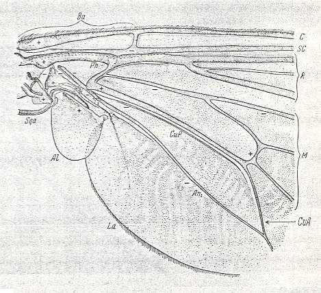 The anal lobe is weakly expressed. The alula and thoracic scale are always absent. There is a germ of the wing-scale in the form of a projection of the hind margin of the basiala.