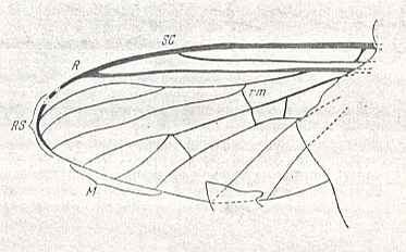 Figure 16a : Wing of Prohesperinus abdominalis ROHD. (Pleciofungivoridae). Length 3.25 mm. Well-developed fork of radial-sector. Original position of the radio-medial cross-vein (rm).