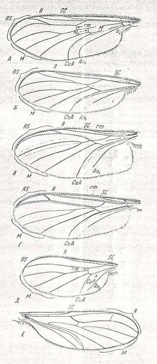 1. Conditionally, we must set, as the first subtype of (primitive traction) tipuloid wings the original [ancestral] form of the dipterous wing, which undoubtedly was most closely related to precisely the primitive traction (tipuloid) wings. This subtype is purely hypothetical, not illustrated by whatever concrete examples.
