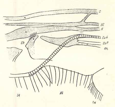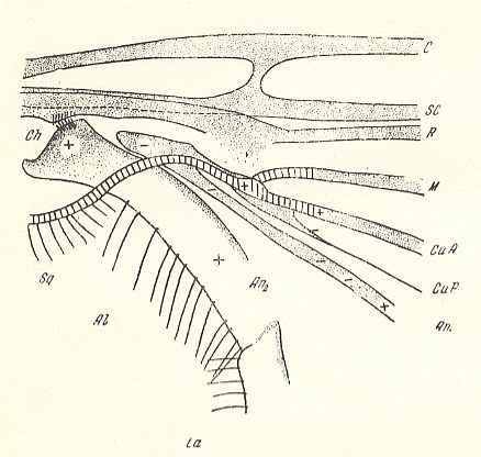 The venation of the basiala consists of not-individualized 'handles' of the main veins (See Figure 8 above ), sometimes coming very close together and moved over, one above the other, forming in this way a characteristically tube-like basiala ( Tipulidae). Wing membrane firm. Sometimes, in the most specialized forms ( Tipulidae), in which the wings are strongly elongated, a characteristic transformation of the venation took place, consisting in the shifting of the forks of the medial veins to the distal part of the wing. This process is peculiar and in essence widens [in the direction of the wing's longitudinal axis] the basal [in text : basialar] part of the wing, being provided with the parallel trunks of the veins, which usually occupy only a third of the wing [See Figure above ]. In Tipulidae, on the other hand, more than half of the wing [length] is occupied by those veins [See Figure above ]. The mechanical significance of this process is still not completely clear. Probably a sharp individualization of the apex of the wing is taking place here, which apex is able to swing relative to the rest of the wing membrane. The swing axis lies along the line of forks of the medial and radial veins.