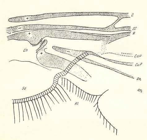 2. A special subtype of the primitive traction wings, which branched off from the original wing-forms of Diptera is represented by architipuloid wings. This subtype is characterized by a moderate increase of size, by an elongation of the wings, and with it in the wing-venation a shift of cross-veins and of forks of the medial and radial veins in the direction of the wing apex was developed. The greater part of the basal half of the wing is occupied only by the straight [rectilinear] parts of the longitudinal veins. The basiala does not undergo mechanical refinement. In it there have only taken place some reductions and mutual approaches of the basal parts of veins.