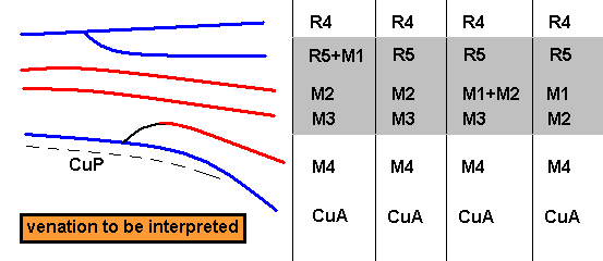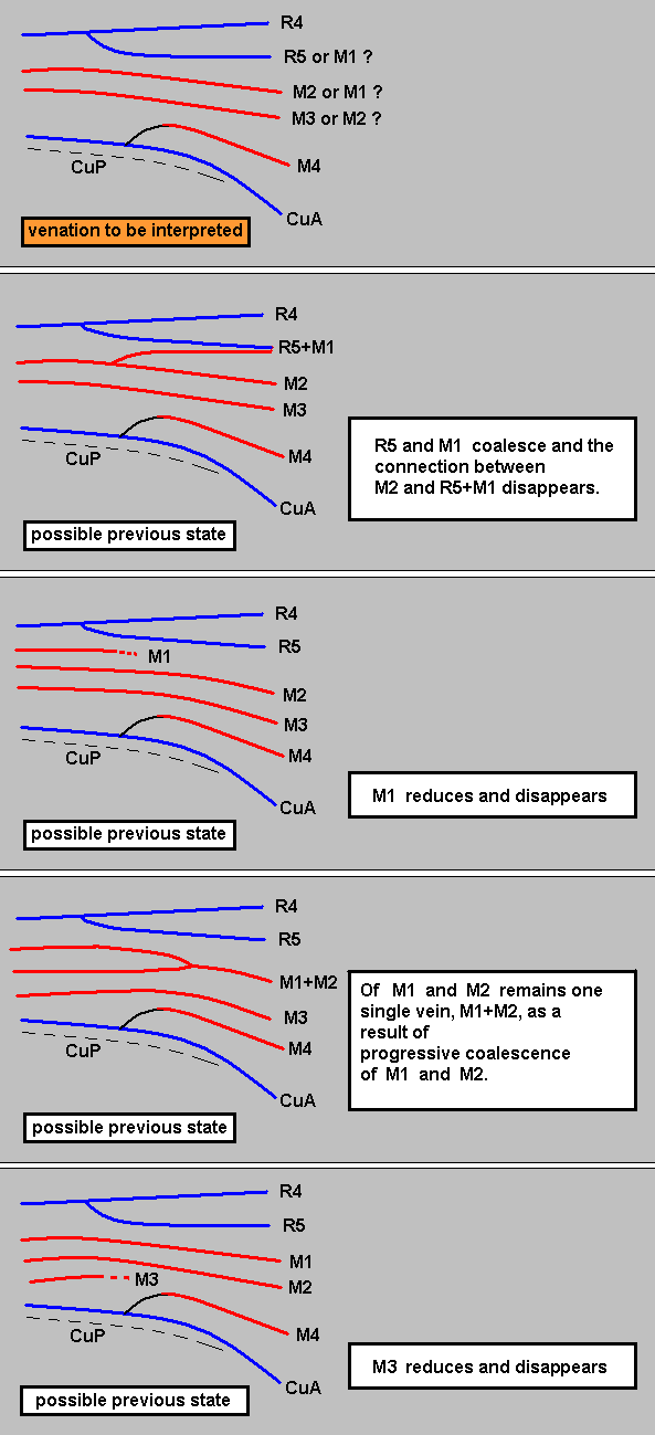 So depending on which transitional form actually exists, the veins in our example can be identified. And the equivocity is, of course only then removed when only one such transitional form exists. In fact the transitional form mediates between the condition in the Medial system in the Order-prototype (four Medial branches present) and that condition in our specimen to be venationally interpreted (three Medial branches present).