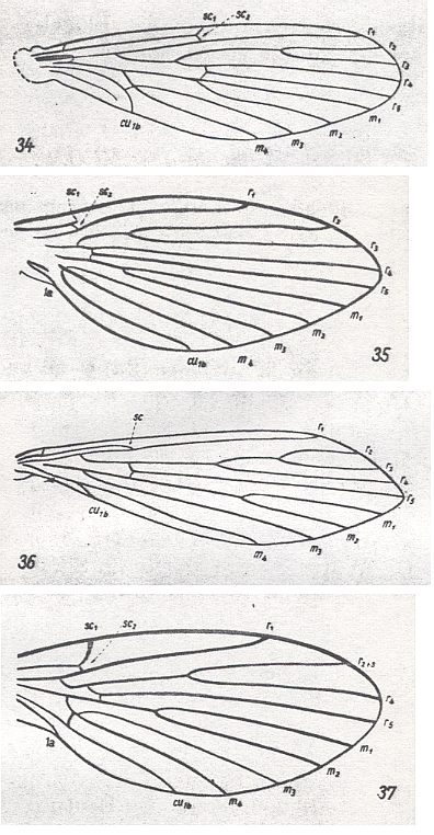 It is necessary to note yet another important feature in the history of the Psychodidea, which consists in the acquisition by these Diptera of small body size. Almost with complete certainty can we maintain the secondary [i.e. derivative] nature of the small sizes of the Psychodidea : to this the rich and complex venation of the wings bear witness, which [venation] became a typical rudiment of the supporting skeleton of the once large wings of their ancestors. See next Figure (consisting of the subfigures 34-37).