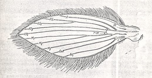 Apart from connections with the tipuloid type, the psychodoid wings are more or less similar to those of the culicoid type [See Part III , where we deal with the superfamily Culicidea (last fifth of document) ]. This similarity consists in the fact that the wings of both types are densely covered by spinelets or scales. However, this similarity is limited by the following feature : the character of the wing-beat. The very structure of the wings points to a totally different pathway of specialization in the blood-sucking mosquitos (Culicidae).