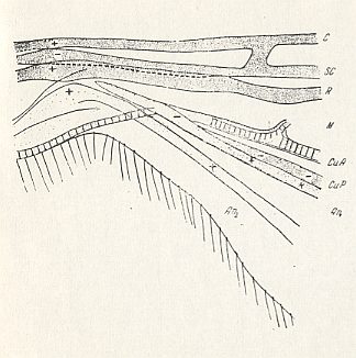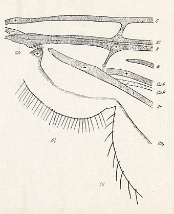 The wing-venation consists of many straight longitudinal veins, fan-like distributed over the wing-blade. The branchings of the radial and medial systems do not lie at a single transverse level in the wing, but positioned in the wing-blade at different places. The venational pattern does not show any sign of costalization. In this respect this wing type sharply differs from all other wings. The costal vein runs all along the wing. The subcostal vein is almost totally reduced. The radial (5 branches) and medial (3-4 branches) are of equal thickness, lying at equal distances from each other, uniformly and insignificantly diverging. Almost all radial veins end up at the wing's fore-margin, while the last radial (fifth) branch ends up at the sharp wing-tip (i.e. at its apical corner). Cross-veins are present only in the form of the short radio-medial (rm) and medio-cubital cross-vein (mcu) being placed near the wing-base [The mcu (and also the rm) is well visible in 37 ( Trichomyia ) of the Figure above ]. The basiala is well developed mainly in Psychodidae. In the Phlebotomidae it is reduced. The venation of the basiala is peculiar. This part of the wing itself consists of two parts : a broad proximal one, and a narrowed distal one. The proximal part, which is the part of the basiala closest to the thorax, carries a germ of the wing-scale, and includes the distinguished basal parts of the costal, radial, and anal veins. The narrow distal part of the basiala includes a large number of individual elements, which consist of (1) the lower part [Russian : nyz] of the cut-off piece of the costal vein (see Figure above ), (2) the vestigial subcostal vein, (3) the basal part of the radial vein, and (4) the two basal parts of, respectively, the cubital and anal vein [ in the Figure just referred to, we can see that, in addition to these four mentioned elements, the distal part of the basiala contains the common trunk of the medial system]. The general structure of the basiala of the psychodoid wing can be characterized as being a peculiar elastic joint which makes it possible for the wing to swing, letting, during the wing-beat, the basiala stand still. The wing-membrane is not especially investigated.