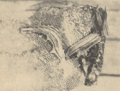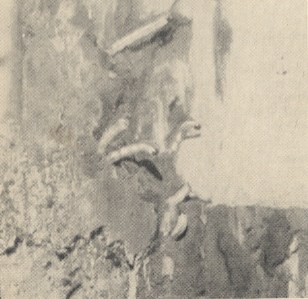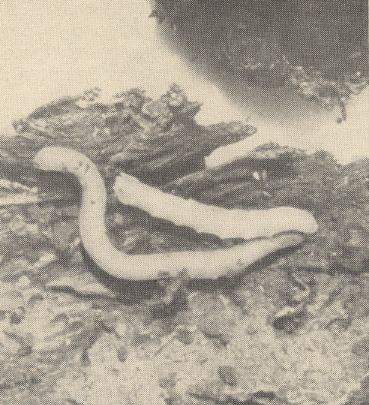 Figure 16 : Larvae of Plecia nigra LUND. [Bibionomorpha-Pleciidae] in wood of tjozenije [Cannot give the English name of the plant]. [See also Figure 11b ]