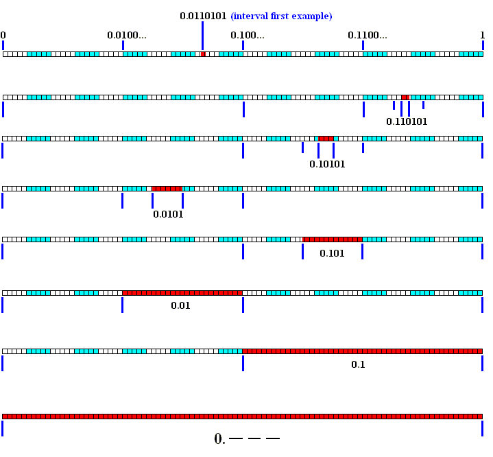 Figure above : Clock doubling of the line segment [0, 1], of which the interval 0.0110101 is followed.