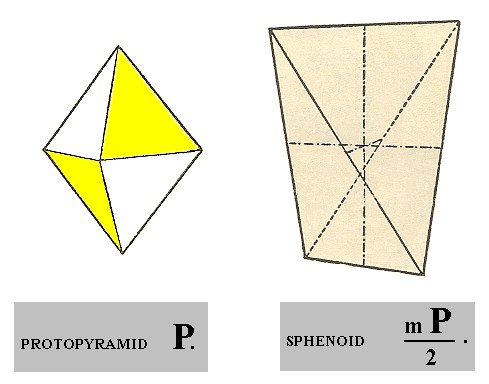 The protopyramid yields two sphenoids, i.e. tetrahedron-like Forms which are however not bounded by equilateral triangles but by isosceles triangles. See Figure 1.
