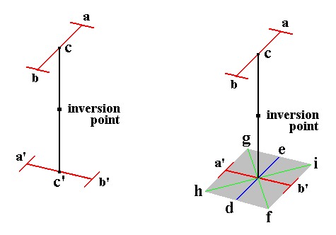 Because of the symmetry of the motifs themselves, additional symmetries (for the whole object, consisting of four motifs) are generated (i.e. implied), namely two mirror planes, one that goes through a' b' c and one that goes through a b c', and two 2-fold rotation axes, going through the inversion point, one lying in the plane f g c and the other in the plane h i c [If we rotate the whole object vertically by 450 then we get the same orientation of the symmetry elements as depicted in the corresponding stereographic projection ].