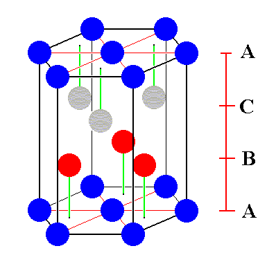 [ Notice that of the spheres belonging to the bottom face of the hexagonal prism, the left back one is masked by one of the newly added spheres in the B-layer. So after the addition of some spheres we still have three layers : The A-layer (dark blue spheres of the bottom and top faces of the hexagonal prism), then the B-layer (red spheres), and then the C-layer (grey spheres).]