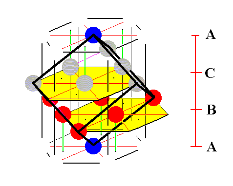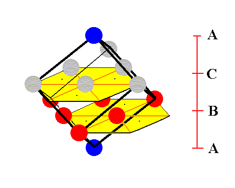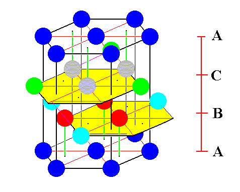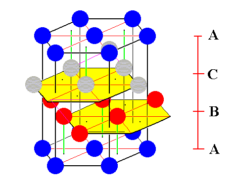When we now add a third layer, we have two possibilities : either the spheres of this third layer come to lie exactly above those of the first layer, or they do not. In the first case the positions of the spheres of the third layer correspond exactly with those of the first, so we can call the third layer A again. When we, when keeping on stacking layers of identical spheres, repeat this sequence, we get the AB-structure discussed in the previous document.
