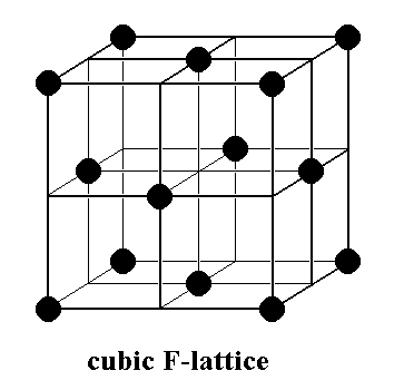A cubic face-centered point lattice is one of these patterns. Its unit cell has the form of a cube, and, in addition to its having points at the cube's vertices (corners), it has also points at the centers of each cube face. This cubic face-centered lattice, which forms the basis of the structure of NaCl crystals, is depicted in the next Figure.