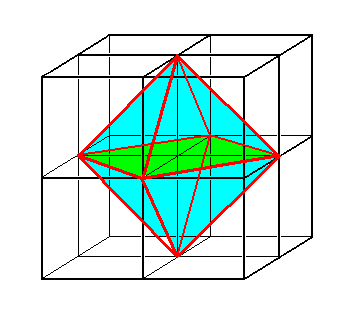 Figure 40. A regular octahedron can be inscribed in a cube. The Figure shows how the eight motif units, as situated at the corners of a cube as in Figure 39, can be associated with the eight faces of the octahedron, or better, with the eight pyramids (that have those faces as their base) that constitute the octahedron.