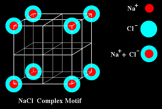The points of such a lattice can be associated with chemical motifs. When the motifs are equivalent with respect to each other, the structure not only has received content but remains (as was the point lattice) periodic. We could, for example, associate the lattice points with Chlorine ions. Or we could associate these points with Sodium ions.