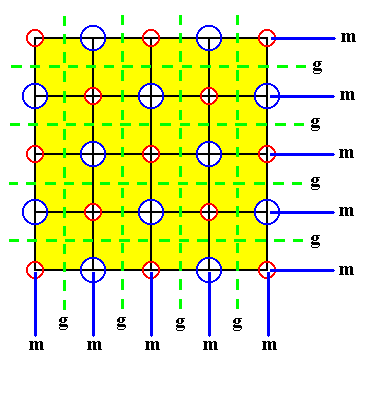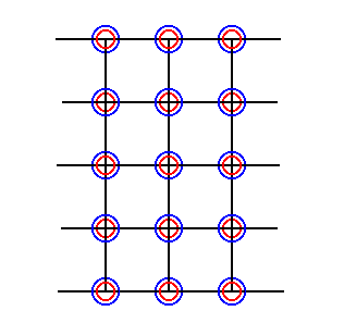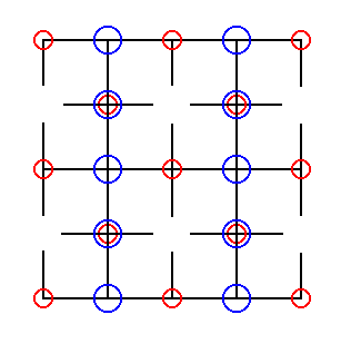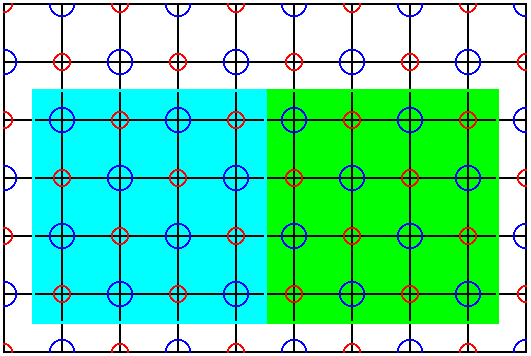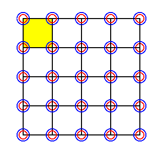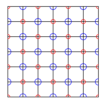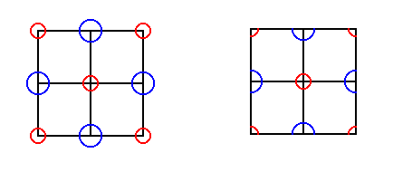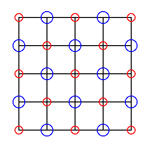 The two-dimensional image of Figure 18 can as such represent the NaCl structure, consisting of two interpenetrating face-centered cubic lattices, one furnished with Chlorine ions, the other with Sodium ions. The next Figure depicts (a two-dimensional slice of) the Clorine lattice of NaCl.
