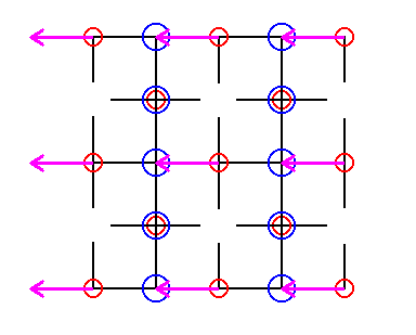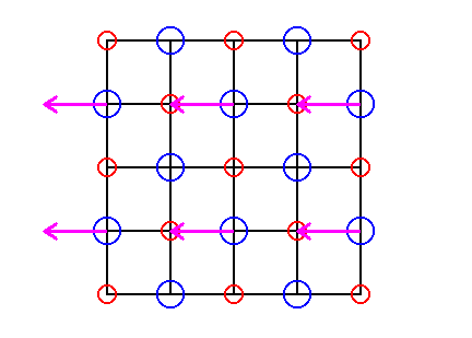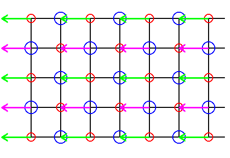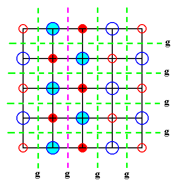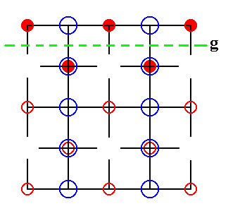 Figure 22a. A two-dimensional slice of the Chlorine lattice. Some translations, involved in the glide line ( g ) are indicated (red arrows). The above mentioned shift will undo these translations (see below), transforming thereby the glide line into a mirror line. The depicted glide line works as follows : The motif is reflected across the glide line (blue arrows) immediately followed by a translation (red arrows) over a distance of 1/2 t parallel to the glide line.