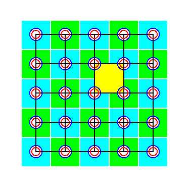 Figure 29. Extension of the pattern in Figure 28. As such it is a 2-D lattice of which the lattice points are occupied with superimposed ions. A unit cell is indicated (yellow). The pattern must be imagined to be extended indefinitly in 2-D space.
