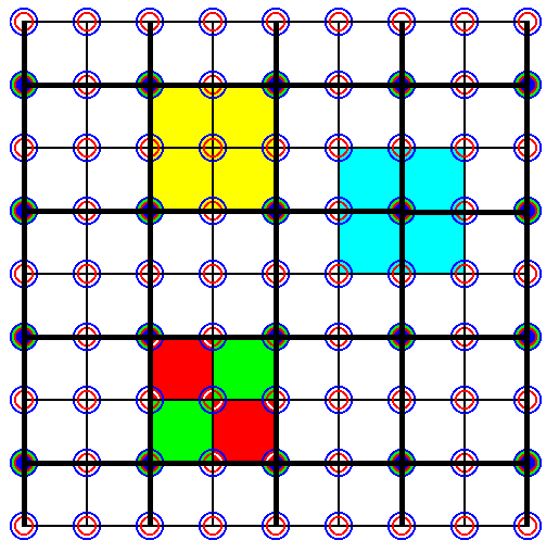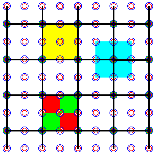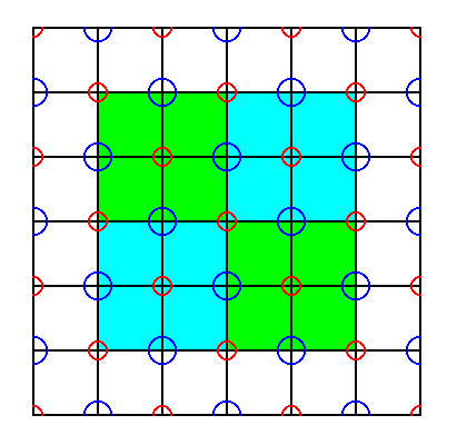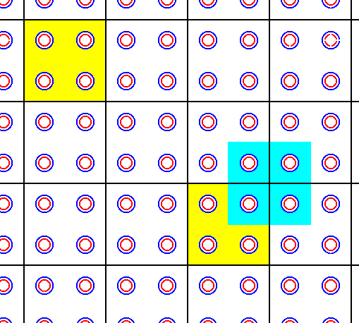 Figure 36. Choice of a larger total motif (light blue) and (correspondingly larger) unit cell (yellow) of the pattern of Figure 34. Now the dark colored points are the lattice points (nodes) of a square net (and this is a net without centerings). The unit cell is indicated in yellow. Below it a same unit cell is outlined, showing the fact that now the unit cell consists, as in the former case, of four motifs, but whereas in the former case each motif consisted of 1/4 Na + 1/4 Cl ions, in the present case each motif consists of 4 x 1/4 Na + 4 x 1/4 Cl ions (Alternatively, we can stick to the original lattice, but then the unit cell is just a multiplication of a smaller unit cell -- the original unit cell -- and is not a genuine unit cell, i.e. not the smallest possible repeat unit having the shape of a square).