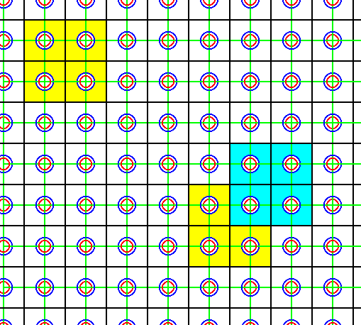 Figure 37. This choice of a larger total motif and (correspondingly larger) unit cell of the pattern of Figure 34 yields a unit cell and a total motif containing only w h o l e i o n s. The intersections of the green lines were the original lattice points. Now the intersections of the black lines are considered as lattice points instead of the original ones. A possible unit cell is indicated in yellow. Also a total motif is indicated (light blue) in relation to the corresponding unit cell (yellow). Such a unit cell (and total motif) is, however, not the smallest one possible (while having the shape of a square). It can nevertheless be chosen as a unit cell, if things are demanding such a larger unit cell, as is indeed the case. We can, however, adapt the lattice, i.e. change our assessment of lattice points, in such a way that our unit cell becomes a genuine unit cell with exactly the same content. The corresponding adaptation of the present Figure will then look like the image of the next Figure.