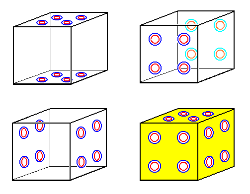 Figure 38a. Four images of the Complex Motif of a crystal of (three-dimensional) Sodium Chloride (NaCl). It is also a unit cell, derived from the 2-D unit cell of Figure 38. It consists of e i g h t NaCl units + motif background. Its symmetry is that of a Cube (regular hexahedron), 4/m 3* 2/m.