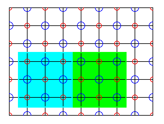 Figure 41. The repetition of the original unit cell (Figure 15a), demonstrated in one sheet of the NaCl structure. We can see that the unit cell is exactly repeated across the structure. However, in addition to one whole ion, each unit cell sheet also contains p a r t s of ions.