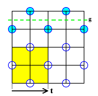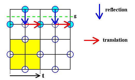Figure 22. A two-dimensional slice of the Chlorine lattice. It is part of the total structure of NaCl. Indicated (yellow) is a face of a unit cell. The arrow represents the distance ( t ) of the simple translations according to which the unit cells are stacked in three dimensions resulting in the periodic structure, the NaCl lattice ( = interpenetration of two cubic face-centered lattices, one with Sodium, one with Chlorine). One glide line ( g ) with respect to the ordering of Chlorine ions is indicated.