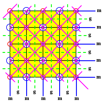 Figure 21. Indication of also the diagonal mirror lines (pink lines) in a two dimensional slice of the NaCl crystal structure. The slice contains a face of the cubic unit cell. In it all glide lines and all mirror lines are indicated. The structure must be imagined to be extended indefinitely.