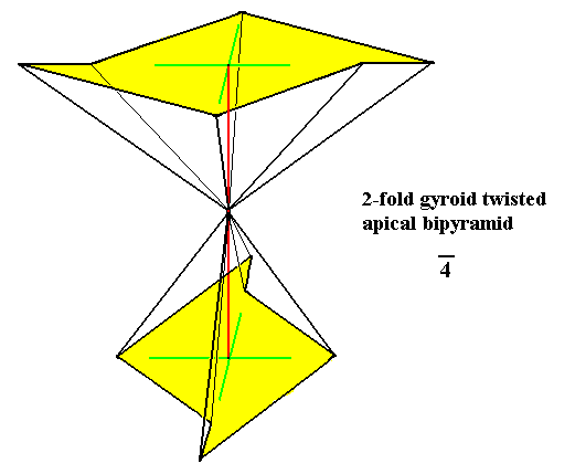 The above Figure depicts a single gyroid 2-fold pyramid. The next Figure depicts an apical 2-fold bipyramid, i.e. two 2-fold gyroid pyramids connected by their tips.